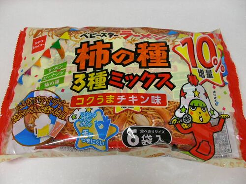 今週は暑い→寒い→暑いの繰り返しで、体もグッタリ…。 こういう時は、おいしいベビースターラーメンでも食べて元気を出すっきゃない!ってことで、コクうまチキン味の柿の種3種ミックスで夕食にしてみたいと思います。 何気にベビースターと柿の種、そしてピ…
