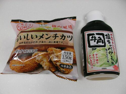 塩キャベツのたれが、まだまだ残っているので想定外な食べ方でじゃんじゃん消費していくことに…。 ってなわけで今回は、揚げ物でもいけるだろうと、ローソンストアの冷凍食品からおいしいメンチカツと組み合わせての夕食としてみたいと思います。 5個を一気…