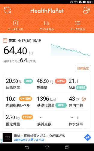 順調に減量は進み、現在は64.4kgということで体重は完全に標準域へ。 内臓脂肪は未だに「やや過剰」判定ですが、あと一歩で解消されるところ。そして、脂肪とともに推定骨量と筋肉量が減ってはいっていますが、これは想定内。減量が終わったら、回復させれば…