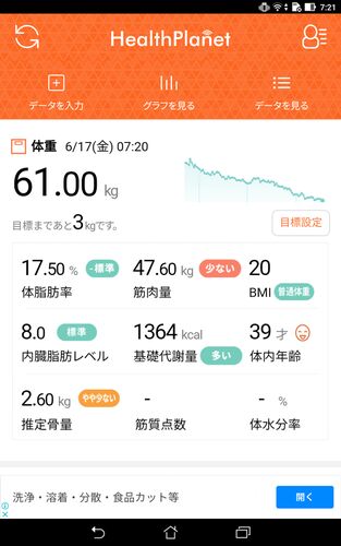 体組成計を購入してから半年間、毎日欠かさず測定を続けてきたわけですが…。 その間、減量をした結果、体重は15kg減、内臓脂肪レベルは8.0、体脂肪率は-標準という成果が出ました。目標体重を58kgと設定はしていますが、BMIが20前後で安定してきたので、今後…