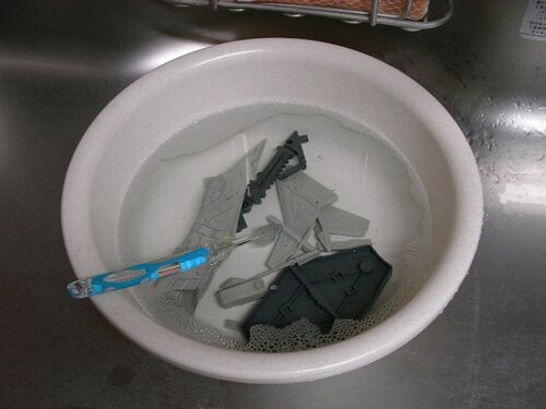 今回から塗装工程に突入! まずは大事な中性洗剤でのパーツ洗浄から…これをしっかりとやらないと残っている離型剤でサフが乗らなかったり剥がれたりしますからねぇ~。あわせて、パネルラインに残った削りカスも、歯ブラシでしっかりと落としていきます。 し…